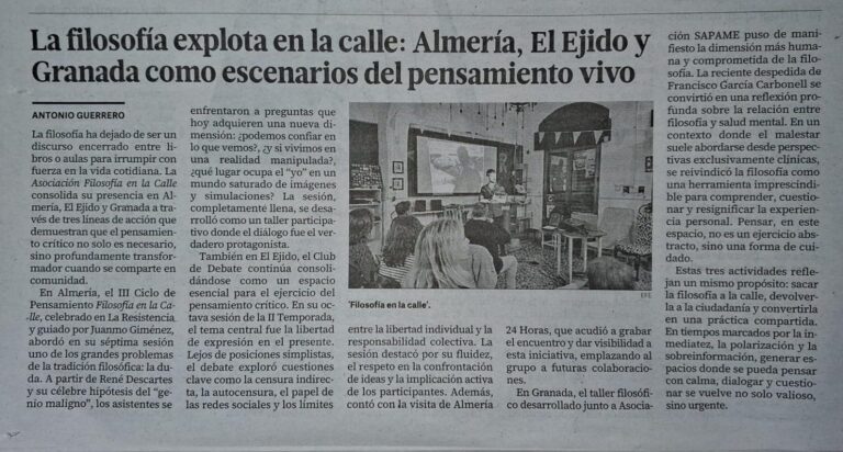 ENLACE A LA WEB: EN TEXTO, ESCRITO POR ANTONIO GUERRERO, EN LA WEB DE DIARIO DE ALMERÍA DICE: La filosofía ha dejado de ser un discurso encerrado entre libros o aulas para irrumpir con fuerza en la vida cotidiana. La…